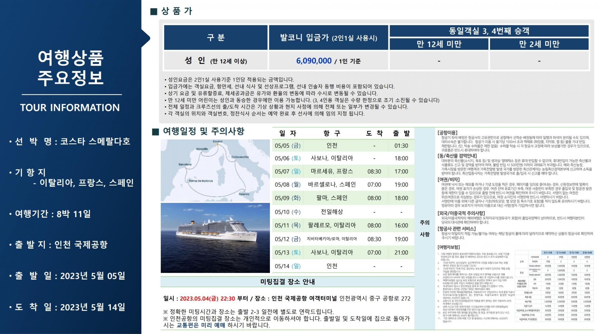 마감~ 크루즈 전문 인솔자 동행 [발코니] 20230505 스메랄다호 스페인/이탈리아/프랑스 8박 10일