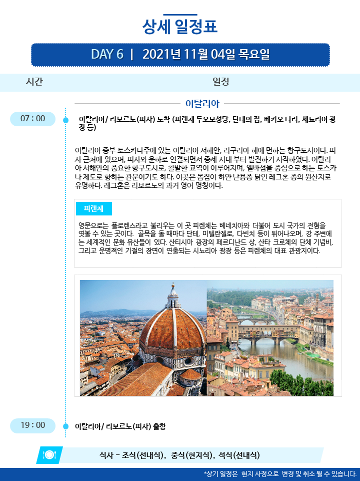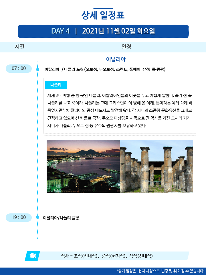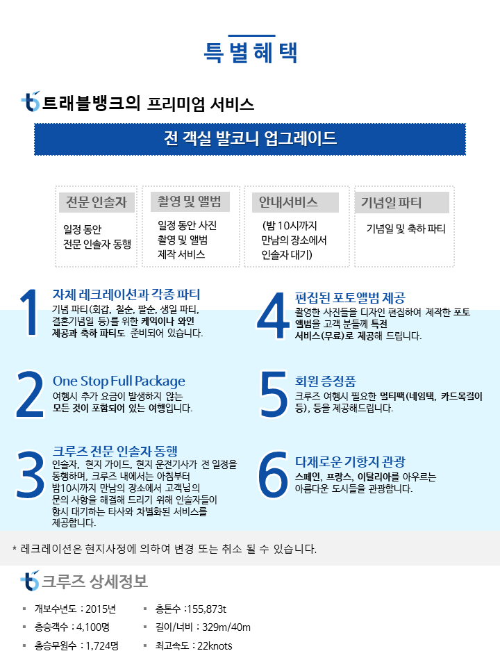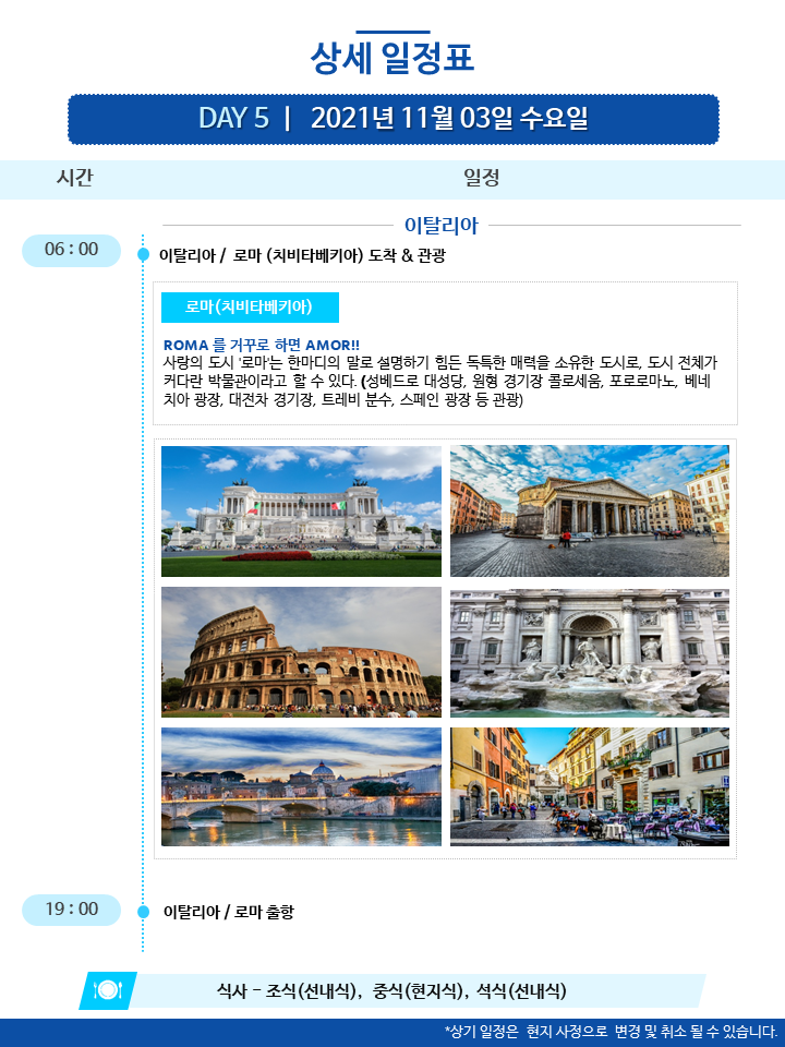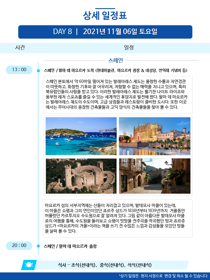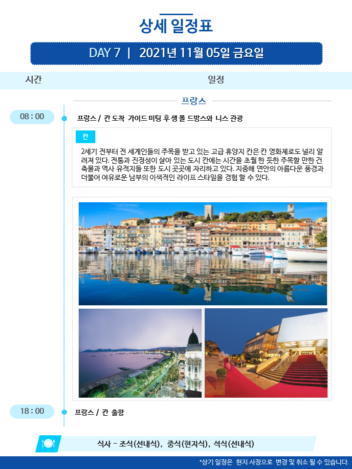 이탈리아 주간 날씨 정보 :http://ko.weather-forecasts.ru/forecast/ru/nera/ 프랑스 주간 날씨 정보 :http://ko.weather-forecasts.ru/forecast/fr/cannes/ 스페인 주간 날씨 정보 :http://ko.weather-forecasts.ru/forecast/es/palma-de-mallorca/ ₩ 5,680,000원 ~ [레크레이션은 현지사정에 의하여 변경 또는 취소 될 수 있습니다.]