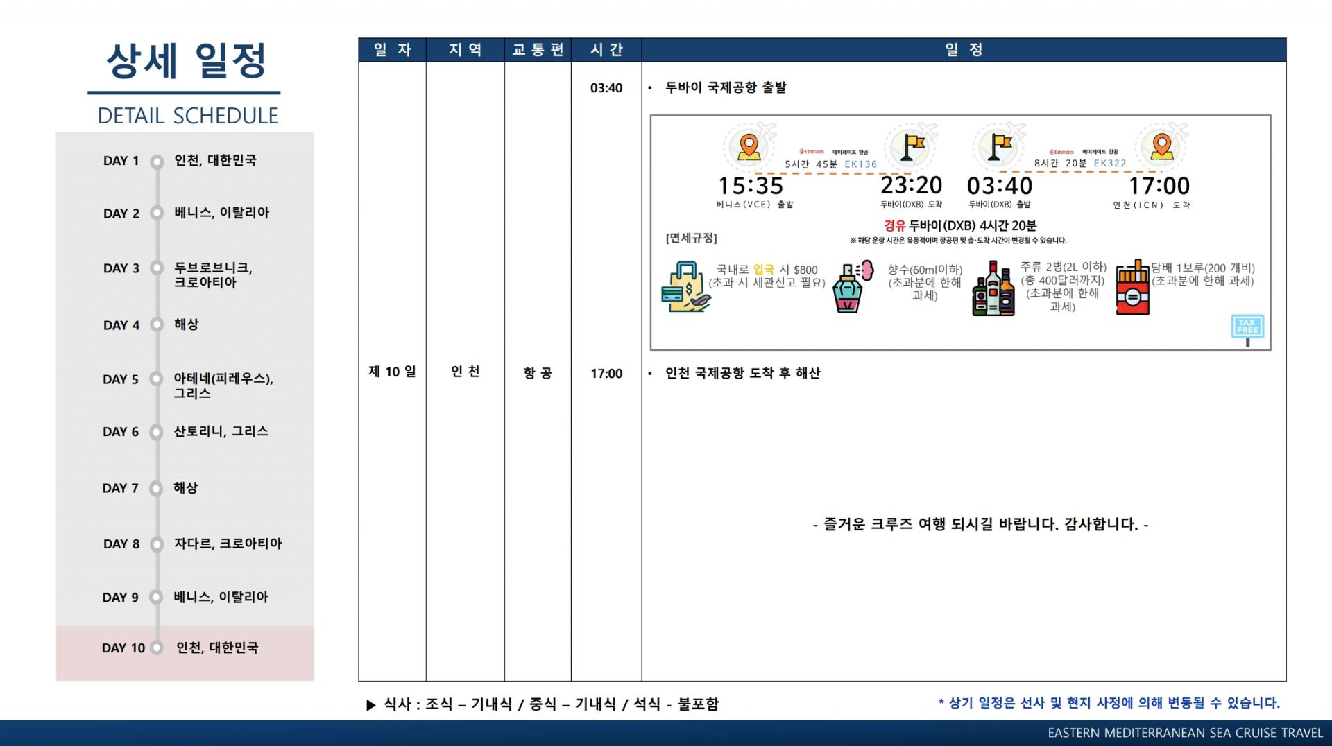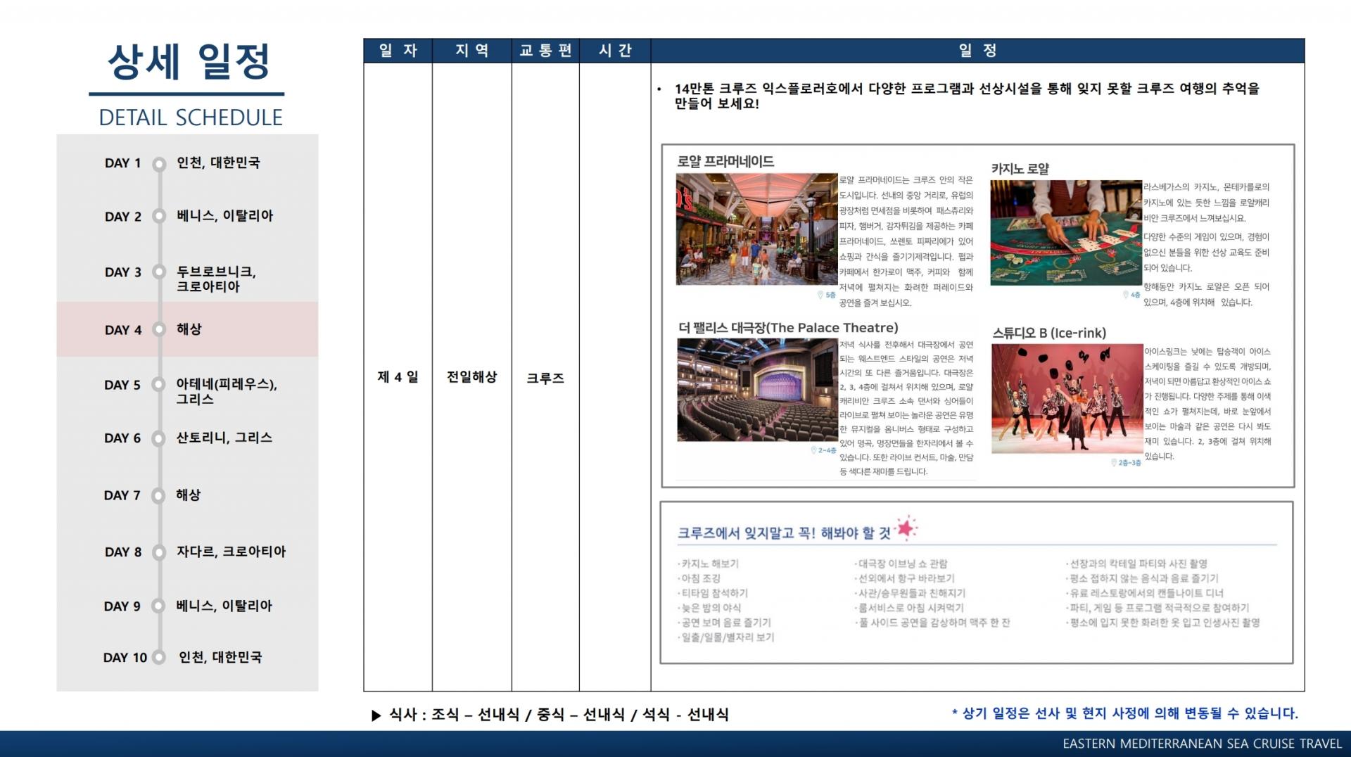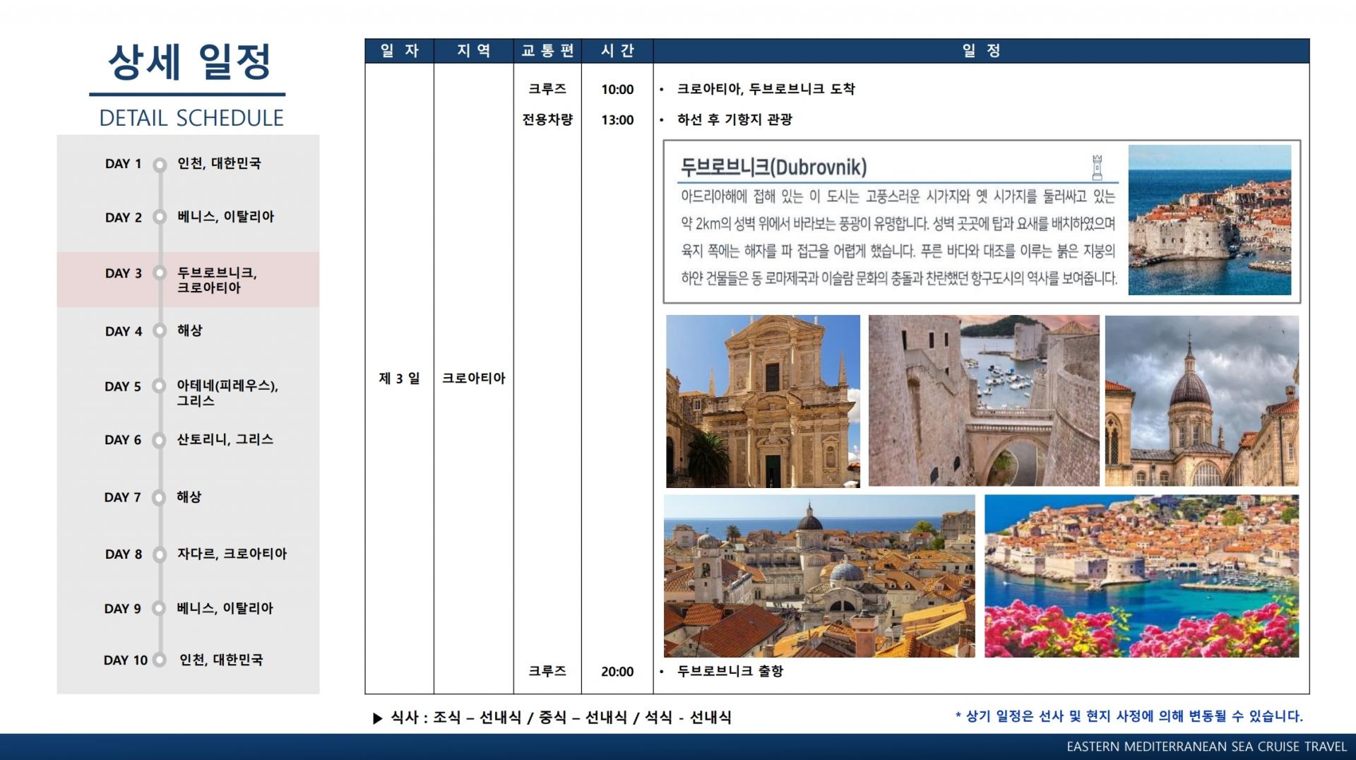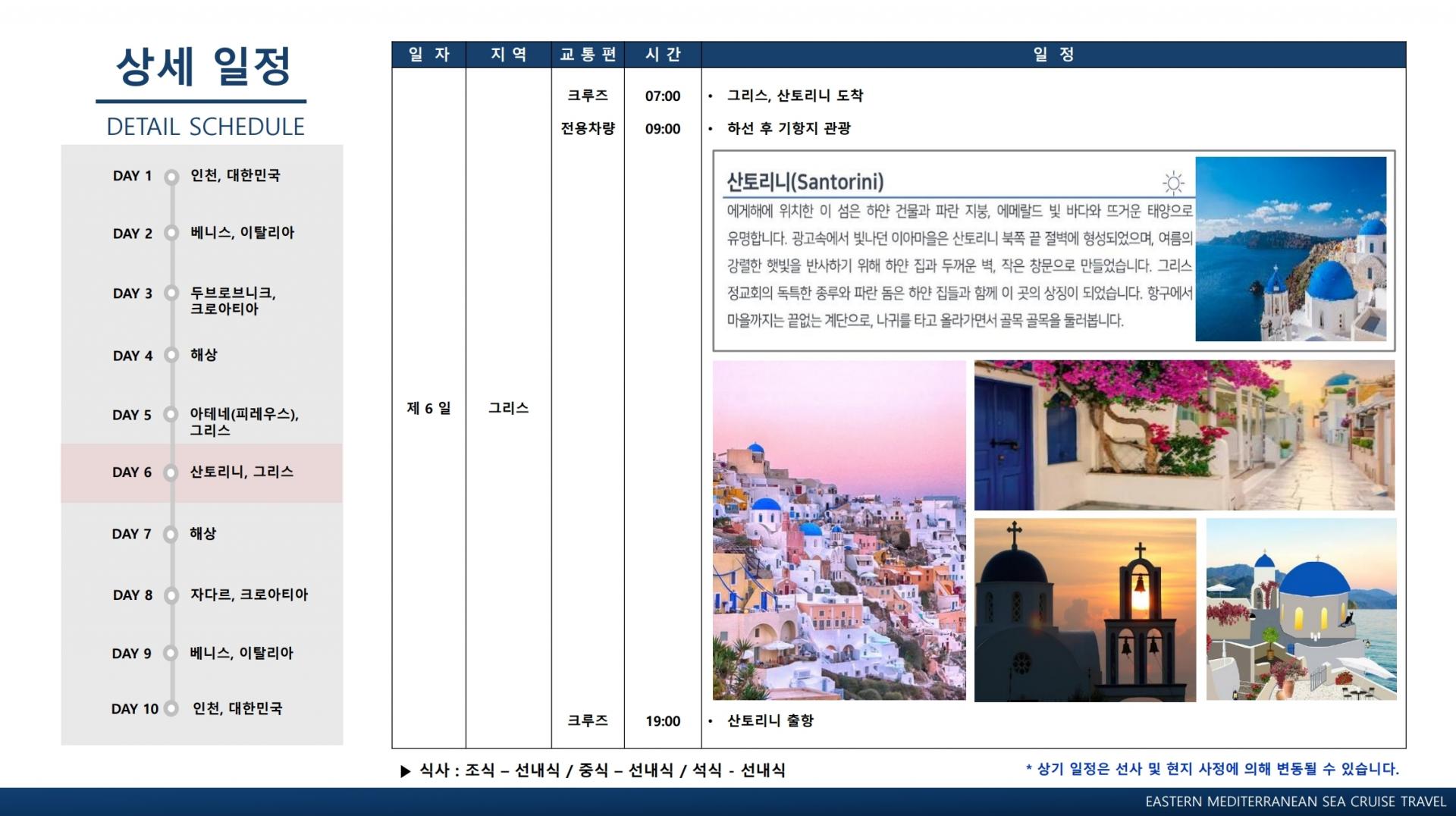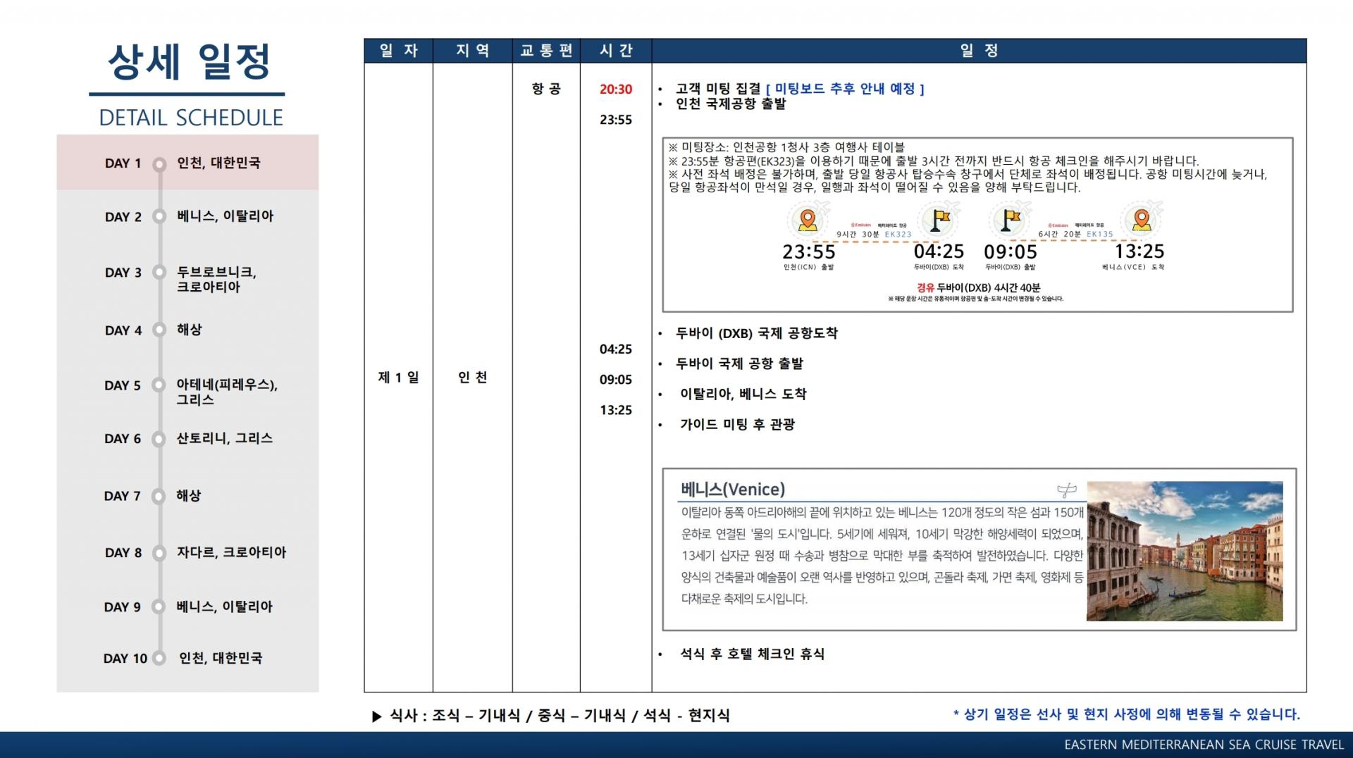 이탈리아 주간 날씨 정보 : http://ko.weather-forecasts.ru/forecast/it/mestre/ 몬테네그로 주간 날씨 정보 : http://ko.weather-forecasts.ru/forecast/me/kotor/ 그리스 주간 날씨 정보 : http://ko.weather-forecasts.ru/forecast/gr/athenes ₩ 미 정 [레크레이션은 현지사정에 의하여 변경 또는 취소 될 수 있습니다.]