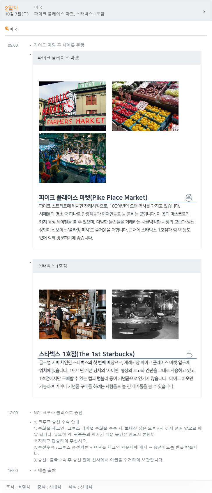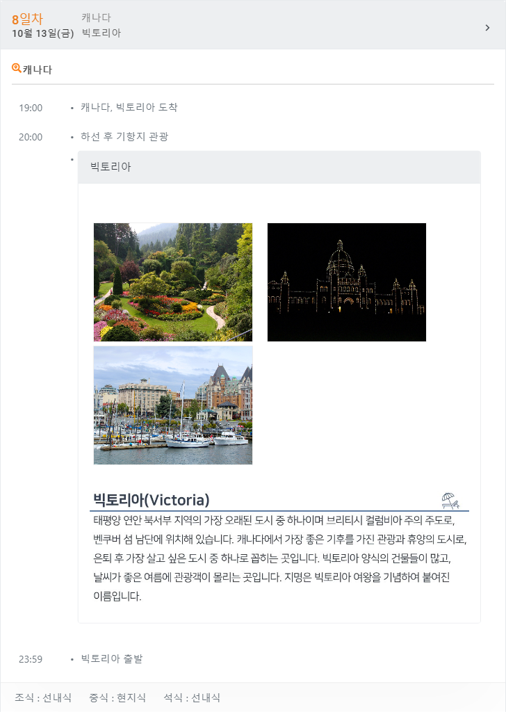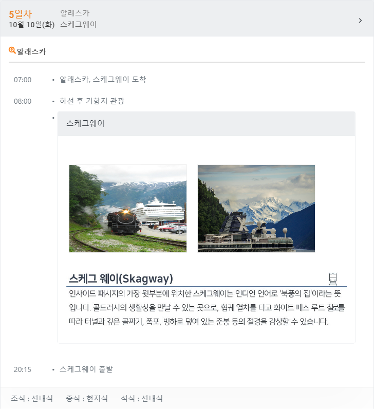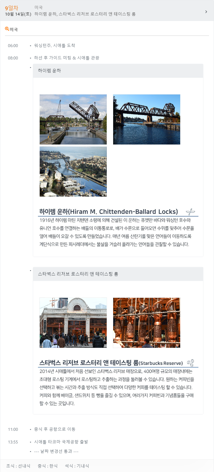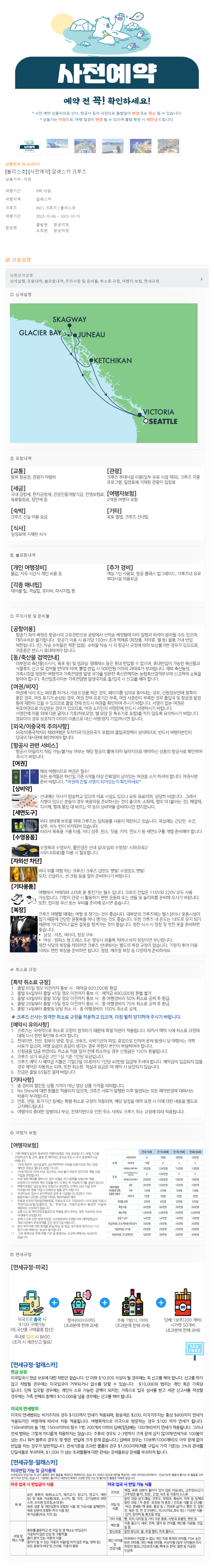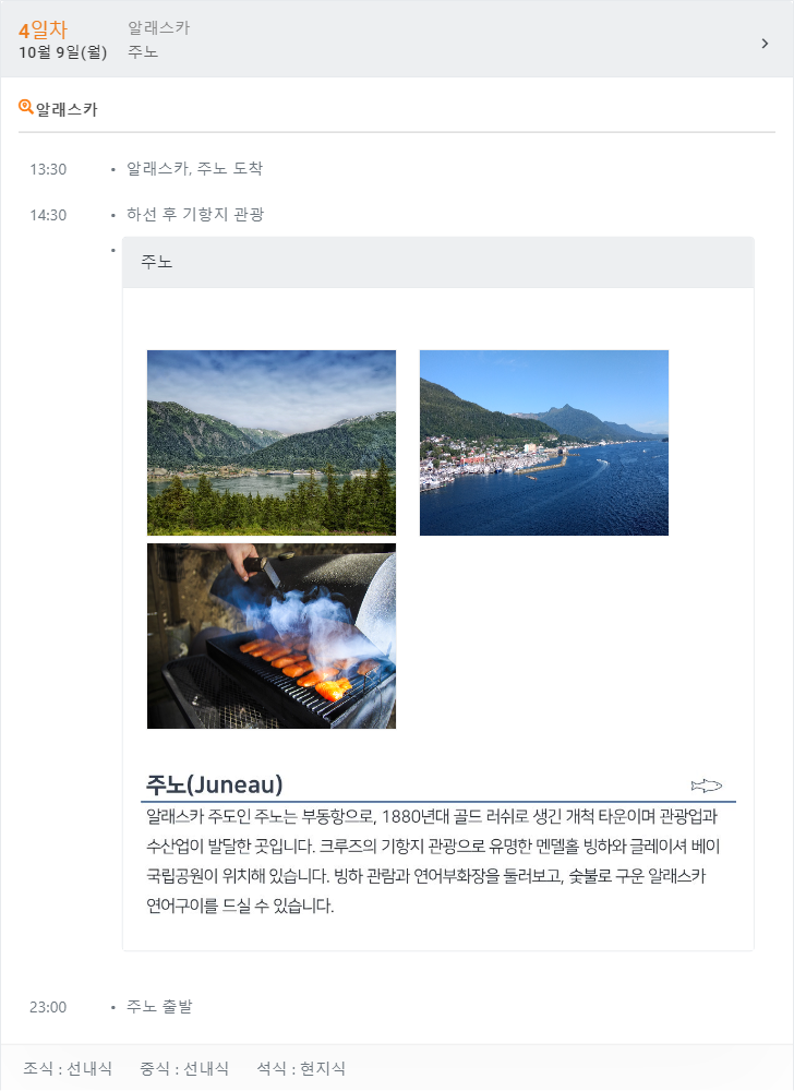 알래스카 주간 날씨 정보 :http://ko.weather-forecasts.ru/forecast/us/juneau/ 시애틀 주간 날씨 정보 : http://ko.weather-forecasts.ru/forecast/us/seattle/ 빅토리아 주간 날씨 정보 : http://ko.weather-forecasts.ru/forecast/us/victoria/ ₩ 6,450,000원 [레크레이션은 현지사정에 의하여 변경 또는 취소 될 수 있습니다.]
